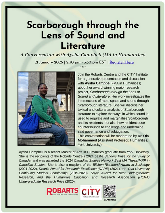 Join the Robarts Centre and the CITY Institute for a conversation w/ Aysha Campbell (MA in Humanities) about her award-winning MRP: Scarborough through the Lens of Sound and Literature.
